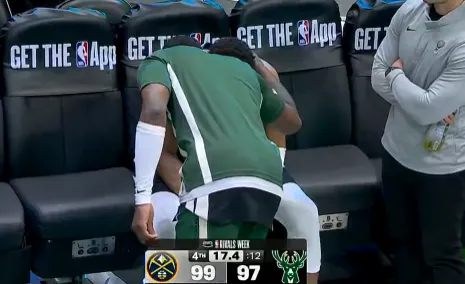 第四节比赛,字母哥在替补席神情落寞,脚部已被缠上厚厚绑带。