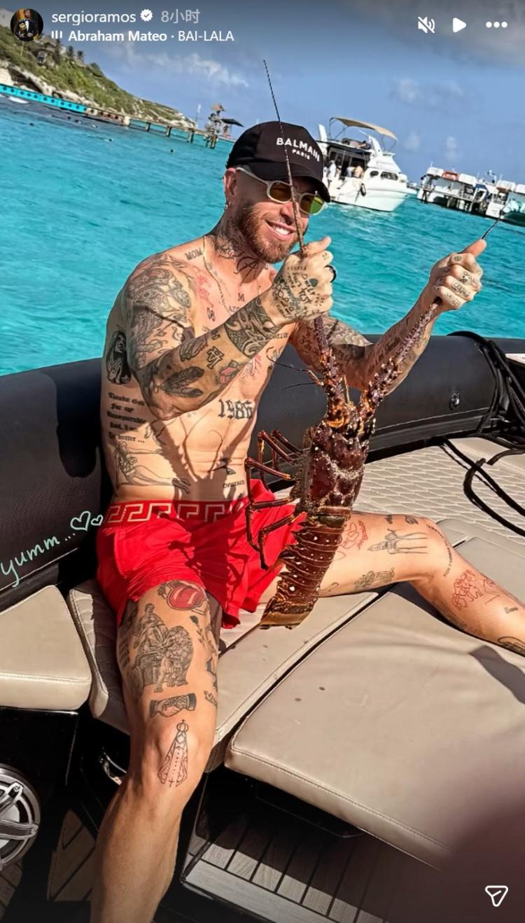 直播吧8月26日讯 拉莫斯在个人社媒晒出自己假期休闲的照片,并与捕获的龙虾合影。